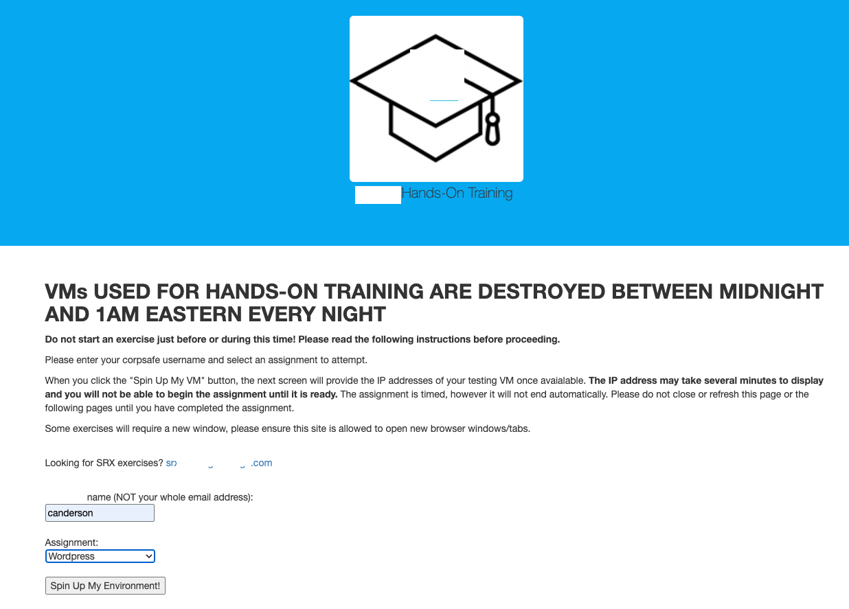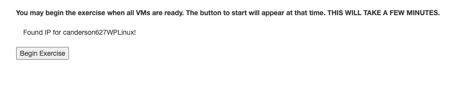 User clicks "Begin Exercise" after waiting for VM to spin up and get IP
